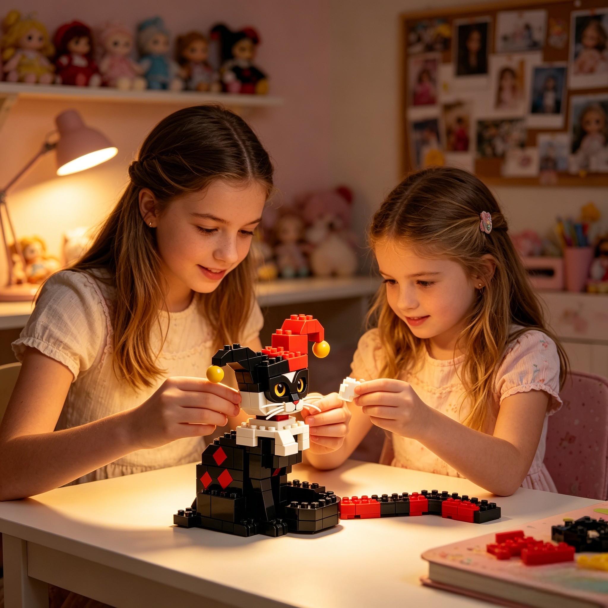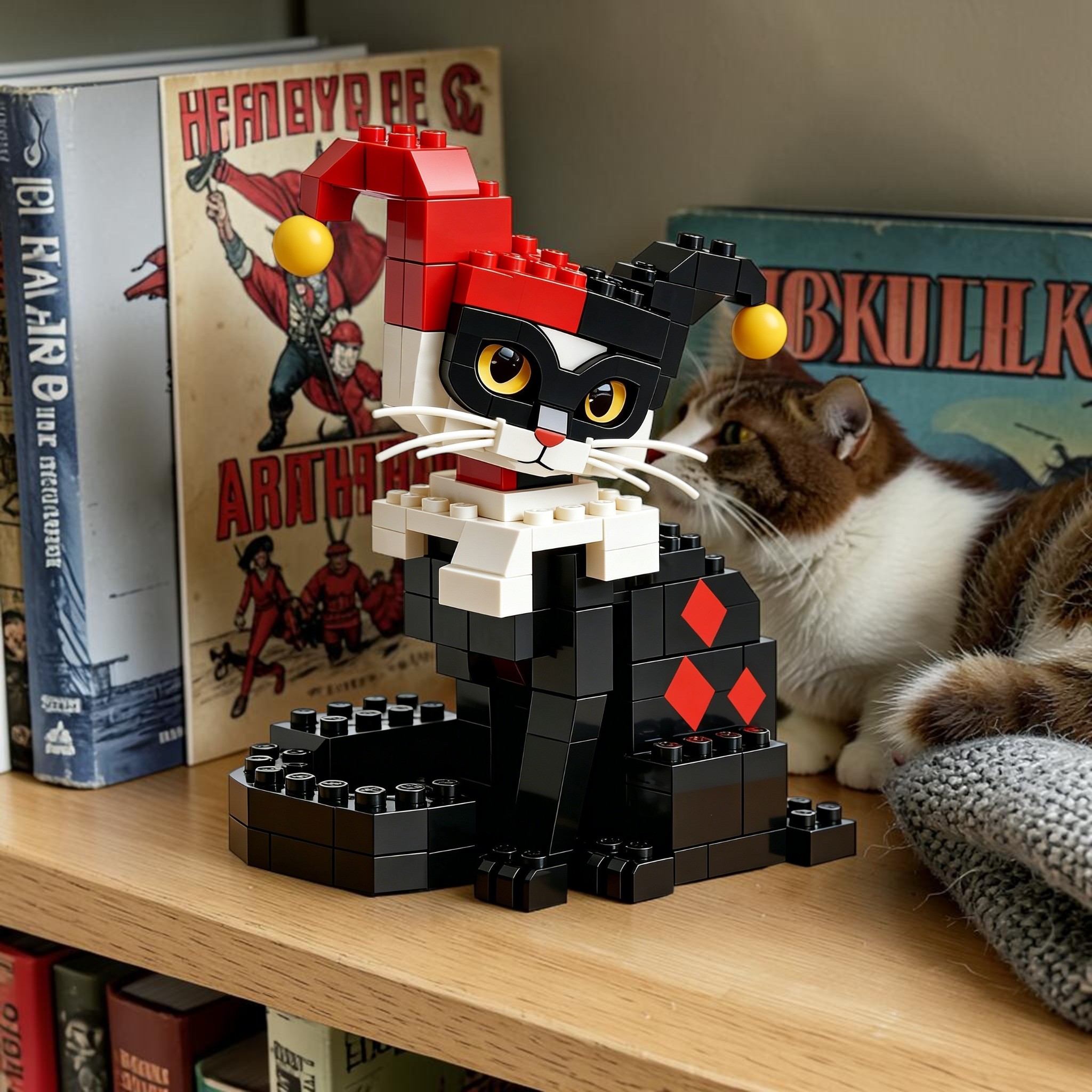We’ve infused the playful spirit of the circus jester into an adorable feline, creating this one-of-a-kind Jester Cat building set. With its iconic red-and-black jester hat, whimsical masked face, and classic diamond-patterned body, this little performer feels like it stepped straight out of a storybook—bringing the perfect blend of cuteness and quirkiness to life, brick by brick.
